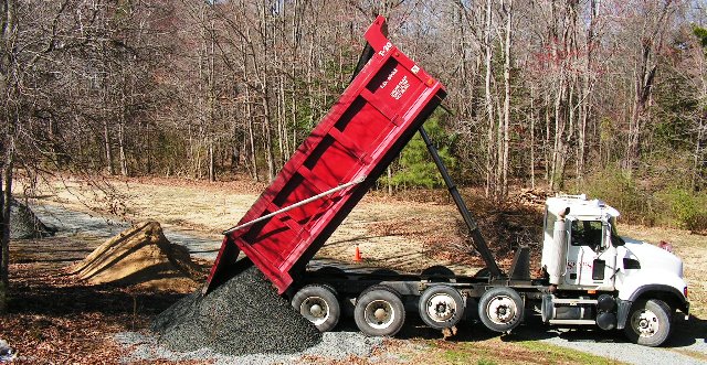 With our week off from the farm house renovation, we turned our focus back to the road building, which has been a constant task since we bought this place a year ago. Tuesday we took delivery of 20 tons of road dirt, 20 tons of crush and run, and 20 tons of #68 gravel..... The deliveries began at 7:00 AM and by noon Joe was working the roads. He worked both Tuesday and Wednesday until after dark. Under the threat of torrential rains, he wanted to get as much completed as possible.